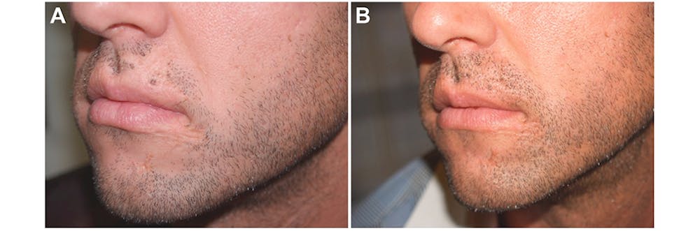 Cleft lip and other scars in the beard region are appropriately concealed with hair transplantation. Patients are advised, similar to scalp scars, of the risk of a lower percentage of hair regrowth. To overcome this risk, several steps can be taken to enhance hair regrowth in the scar, including deeper recipient sites, transplanting into mature scar (at least 12–18 months), using mostly two and even three-hair grafts, and injecting platelet rich plasma at the time of the procedure. Fig. 4 shows an example of facial scarring treated with hair grafting.