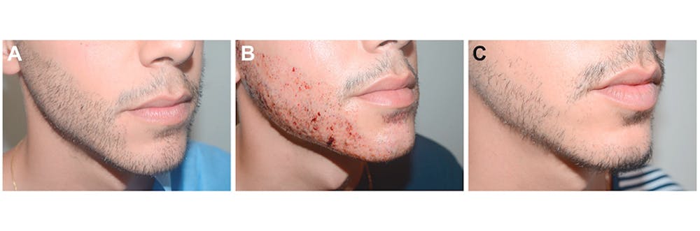 Care for these FUE removal sites involves the application of antibiotic ointment for the first 3 days. Normal face washing can be resumed on the second day unless grafts were placed back into the beard in which case dry-face precautions are followed for the first 5 days. Healing is typically rapid with these FUE removal procedures, with most patients having at most only minimal pink dots after 3 days. If a subsequent beard transplant is desired, it can be performed as soon as 6 weeks later.