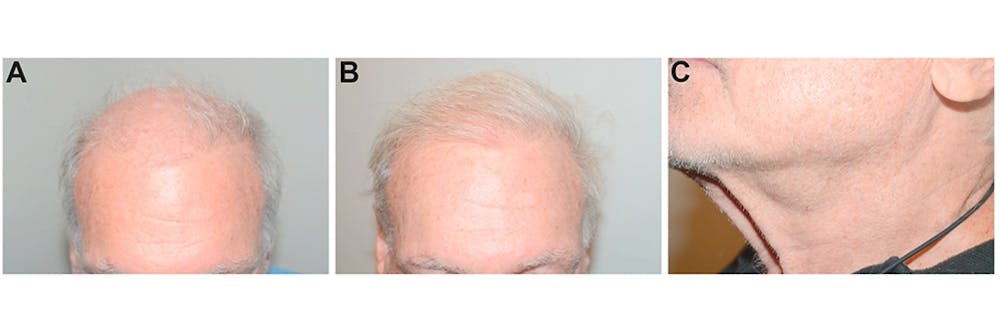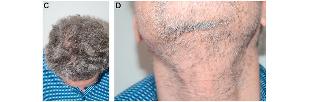It is uncommon for most patients to be willing to lose their entire beard. Most prefer to add 800 to 1000 beard grafts to the maximal number of scalp hair grafts of 2400 to 2800 that can be harvested in a single procedure, thus increasing the total graft count by 30% to 40%. These beard hairs will most commonly come from the portions of the beard in the upper neck and below the jawline, essentially leaving no detectability that these hairs were harvested while providing a significant greater amount of scalp coverage (Fig. 7). There are, however, some patients, including male-to-female gender reassignment patients and older men, who are motivated to have as many as 3500 grafts removed from the beard in a single procedure to achieve maximal scalp coverage in addition to the available scalp hairs (Fig. 8). Even with these large graft extraction numbers, there is essentially no visible scarring of the beard region, with a small risk of delayed healing of the chin mound. Thus, this area should be an area of last choice.