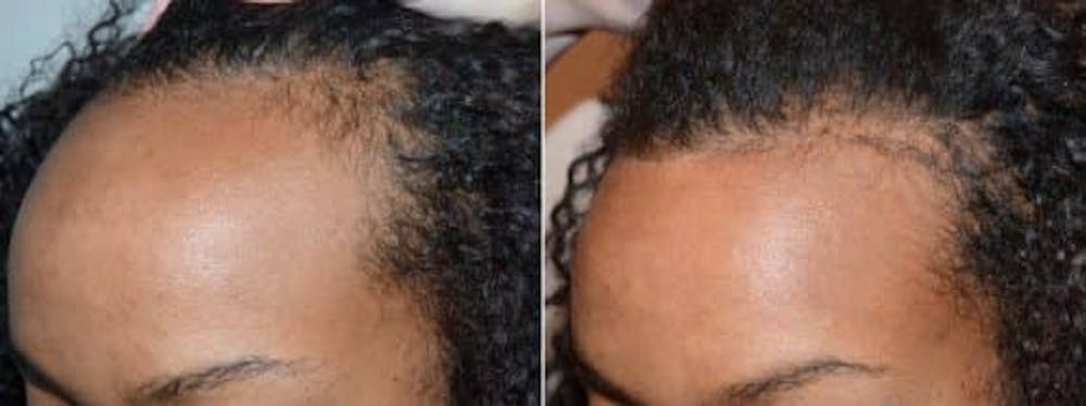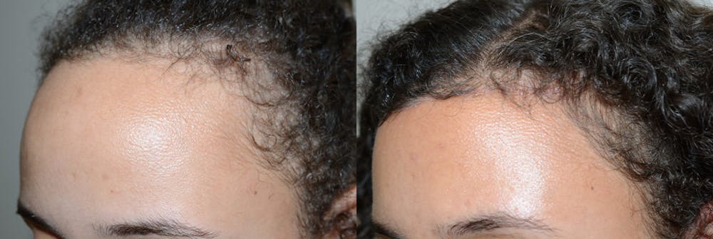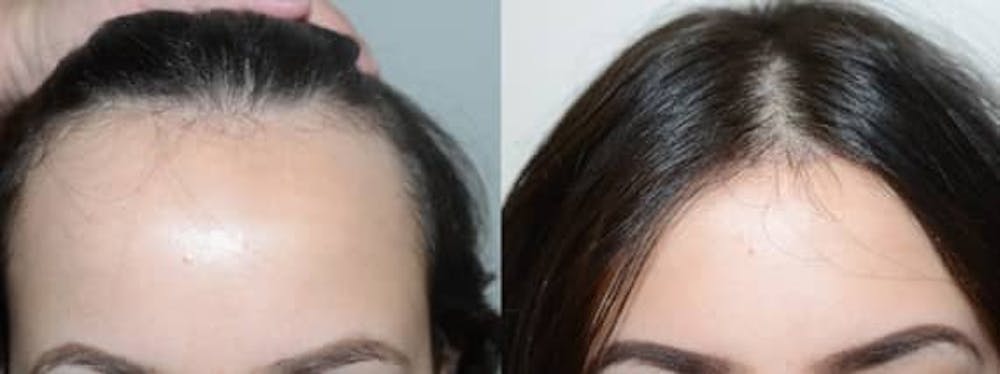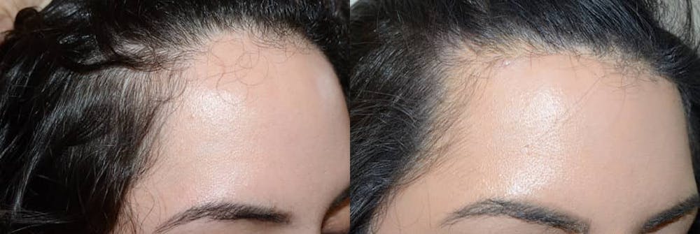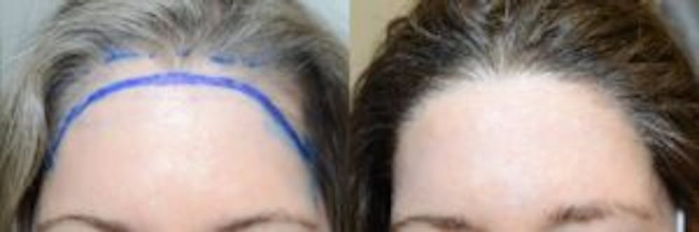 Hair transplant surgery can be an effective alternative to the hairline lowering surgery, particularly when primarily rounding out is desired — here is a patient before and after one procedure of 2,800 grafts