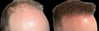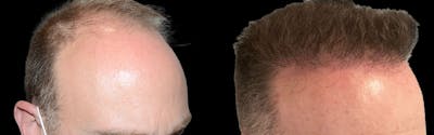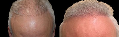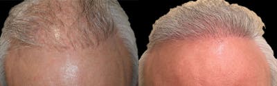 Before and just 6 months after 5100 FUE grafts mostly from the beard and supplemented with the scalp, on this 58 year old patient. This patient had undergone hair grafting many years prior with a largely depleted scalp donor supply. He received an excellent result at just 6 months with a large transplant procedure conducted over 1.5 days consisting of 3500 beard and 1600 scalp FUE grafts.