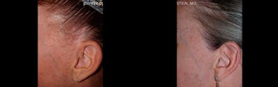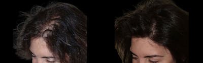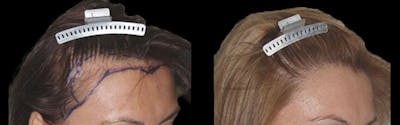 Before and after hairline lowering surgery. Done to improve density after two insufficient prior transplants. By advancing the patient’s natural hairline, the entire previously grafted area, including scarred skin, was excised, allowing for a more natural and denser result.