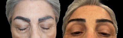 Before and after eyebrow transplant removal/excision, followed by a “heroic” eyebrow restoration to repair a prior eyebrow transplant that resulted in significant scarring. The first step was to excise completely both eyebrows, then 3 months later, she underwent a bilateral eyebrow transplant of 375 grafts per eyebrow. Final result shown at one year.