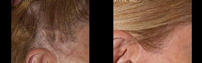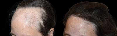 Result of 1850 FUE grafts to advance an overly high and receded hairline. In this 35yo female, her hairline issue was primarily the sides/frontotemporal recessions being receded, so hair transplantation was the preferred method of addressing to create a more feminine hairline.