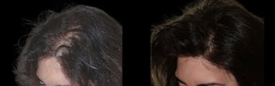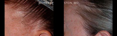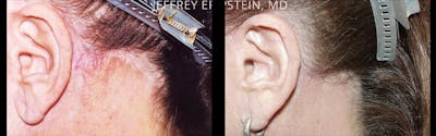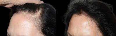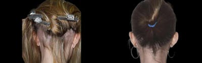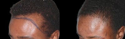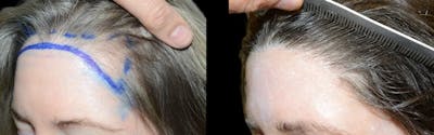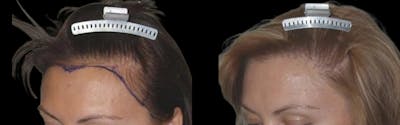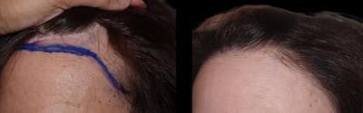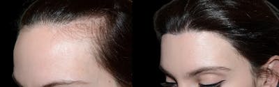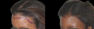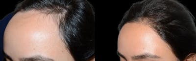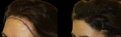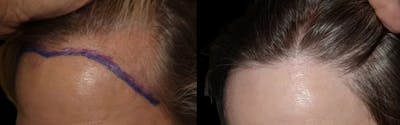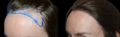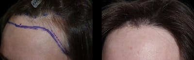 Patient is 29 years old. Before and after hairline lowering/forehead shortening surgery, also called the surgical hairline advancement for the lowering of the hairline by 3 cm. Hair grafting was performed three months later to help round out the hairline for the most feminine appearance.