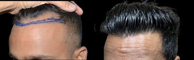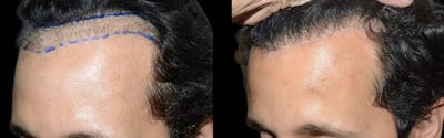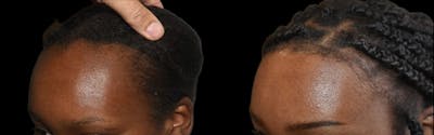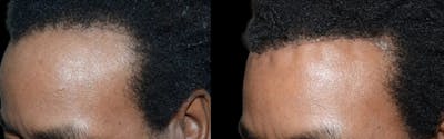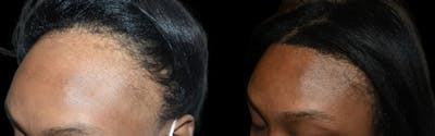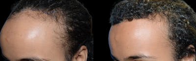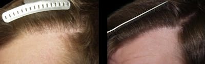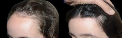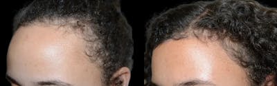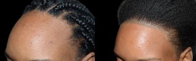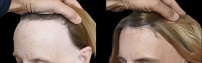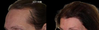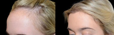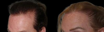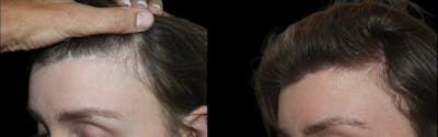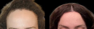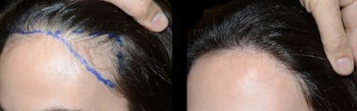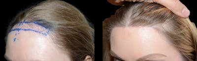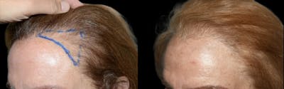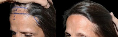 Hairline lowering surgery performed as a reparative procedure on a patient who was disappointed with the results of a hair transplant done elsewhere, so she underwent hairline lowering/forehead reduction surgery where the entire prior grafted area was removed and her own natural hairline was brought down and forward by almost one inch. She is shown before and 6 months after.